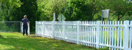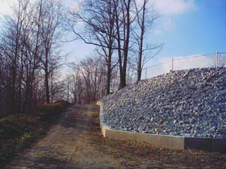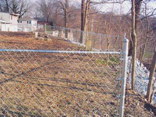 The picture on the left shows the hill that was cut into by the large backhoe parked in the driveway. The earth, stones, and skeletal remains were dumped down the slope to the left of the driveway. The picture on the right shows the results of restoration efforts after six years of work. The retaining curb controls "rip-rap" rocks; the rocks prevent erosion. The chain link fence along cemetery border marks the sacred ground and is an attractive addition to the neighborhood.