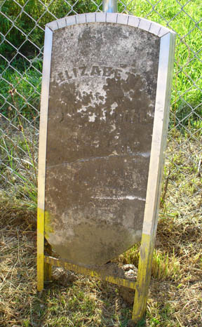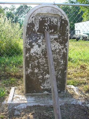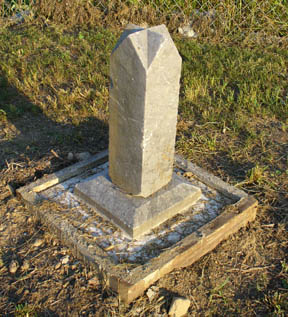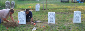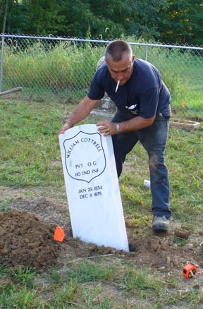 In the case where a veteran has lost part of the original marker, the replacement stone is set beside the original. At right, the top part of John Cottrell's original stone, leaning against the fence, will be placed inside the wood frame beside the VA replacement stone. The wood framework forms the cement for the new bases as in the picture below left. |
