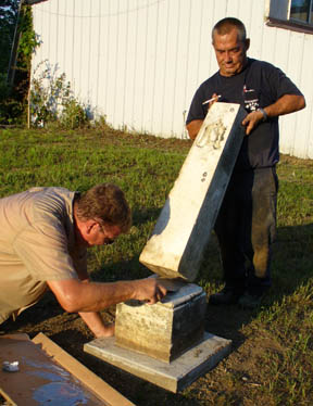 On a stone of later vintage, Larry applies the epoxy to the base, left, and around the metal stakes that help secure the top. At right, Herb and Larry position top onto stakes and foundation. |