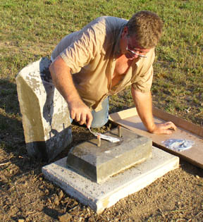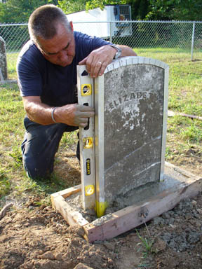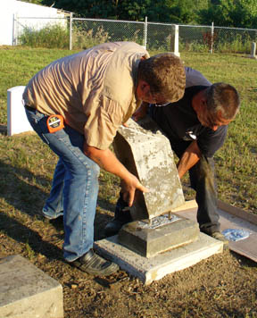 Repositioning and aligning lopsided bases are also parts of cemetery restoration. Securing the parts of unbroken markers follows. Again, epoxy is used to "glue" the parts together.