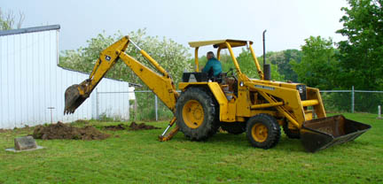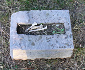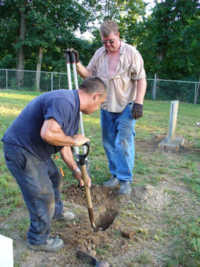 At left, a rectangular hole, around twenty inches deep, is dug into the ground. An couple inches of pea gravel are placed in the bottom and the stone, at right, is inserted and aligned. Pea gravel then fills the hole and supports the stone on all sides. A layer of earth is placed over the gravel. |