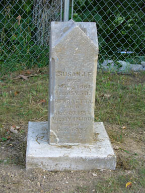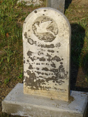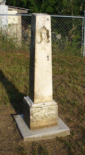 While black liken still mars the fronts of two of the stones above, it is remarkable that any stones survived the destruction rendered upon the Cottrell Cemetery. The stone of Abraham Cottrell, 1803-1889, is at left, and the marker for sisters Henrietta and Susan Doty is in the middle. At right, the picture of the new base for the "dove stone" should be compared to the picture toward the top of the page which shows this stone in the undergrowth and leaning against a tree.