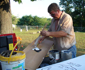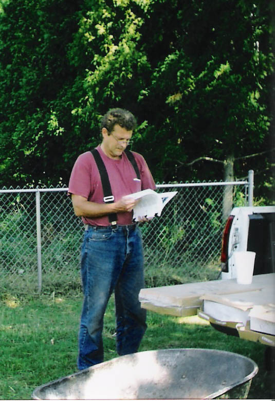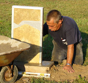 Herb Justice finishes the cement curb for this stone, at right, which shows the epoxy in gray and the surrounding aluminum frame. The aluminum is cut precisely to fit the stone as can be seen by comparing the stone at right and the pictures below, left and middle. |