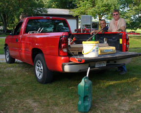 At left, Rob Hains consults the Cottrell Cemetery book which compiles information from historical records, transcriptions, and personal remembrances. At right, MCCC Chairperson Ranny Simmons (dark blue shirt) and Cottrell family members then unloaded the new, crisp, individually boxed veterans' replacement markers. |