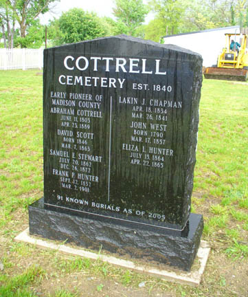 After six years of restoration, the Cottrell Cemetery containing almost ninety individuals has been cleaned of machinery, debris, junk, and undergrowth. The area has been protected from erosion, re-landscaped, and reseeded. The perimeter has also been opened so that neighbors and travelers can view and appreciate this piece of Madison County history.