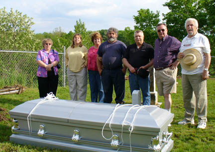 Cottrell family members pose with casket containing the remains of four individuals originally buried in their family cemetery. The re-interment of these remains represent the completion of the Cottrell Cemetery restoration project which took seven years. The rededication ceremonies were Sunday, May 21, 2006.