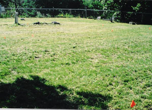 MCCC volunteer Rob Hains then marked the location of each grave with a red flag on a metal stake sunk into the earth. The picture at right shows the landscaping and new grass and is looking back toward the driveway and downward slope of the hill. |