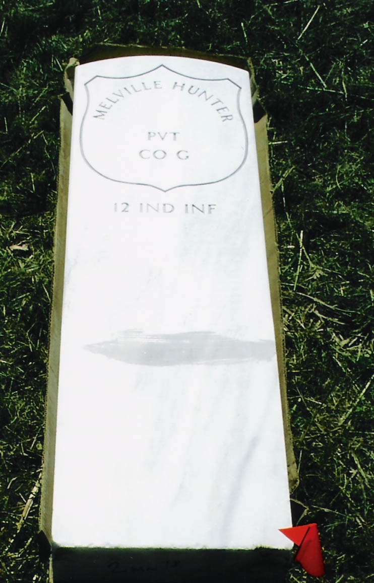 On the left, family patriarch John Cottrell was a soldier in the War of 1812. On the right, the stone of Thomas Cottrell shows the shield used to designate a Civil War veteran. In the middle, the picture of Melville Hunter's stone shows the substantial length of the VA markers.
