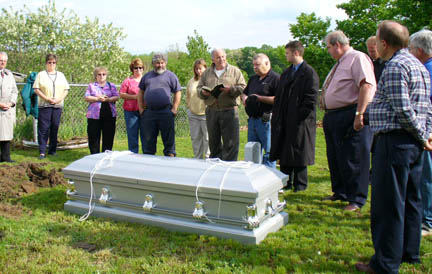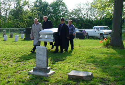 The last task in the restoration process for the Cottrell Cemetery was re-interring the human bones unearthed during the desecration. The bones had been confiscated, studied, and DNA tested by the University of Indianapolis. The scientific results disclosed that the bones were from four individuals: one female over fifty who was a Cottrell relative, a male over forty, and a male and female each in their twenties. A few days before the scheduled rededication ceremonies, the U of I released the bones to Cottrell descendant Richard Kreegar, who is at right in the bottom right photo. Anderson funeral home Brown, Butz and Diedring graciously donated their time to transport the remains from Indianapolis, their help during the re-interment process, and the silver-colored casket used for the reburial. After seven years of dedication and hard work from all invovled, on Sunday, May 21, 2006, rededication ceremonies were held for the Cottrell Cemetery in Green Township, Madison County, Indiana.