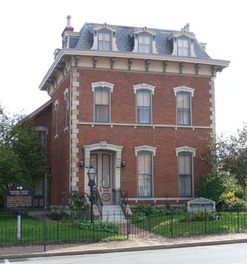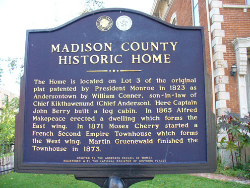 As the marker, above left, from the National Register of Historic Places explains, the Gruenewald house, right, northwest of the Madison County Jail, seen at the top of the page, was originally the site of one of Capt. John Berry's log cabins. Berry received his land patent from President Monroe in 1823 and purchased the Lenni Lenape village from William Conner, son-in-law of Chief Anderson.
