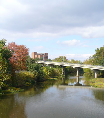 Looking northwest from the middle of the Wapihanne (White River), the bank to the left was the area of Wapiminskink, "chestnut tree place." The personal camp of Chief Kikthawenund (Chief Anderson) was to the left of the Eisenhower Bridge, seen in middle ground--or with a city map on the southeast corner at the intersection of Central and 8th Street. The red brick building in the background is the Madison County Jail. The rest of the skyline for Andersontown (Anderson) is hidden by the fall foliage which graces the river's banks, now part of a pedestrian parkway. |