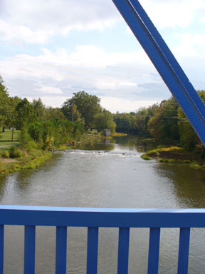 This view, looking between the blue, iron girders of the pedestrian bridge which spans White River, is looking southeast. Chief Kikthawenund would have seen members of the Lenni Lenape from Muncietown and Buck's Town canoeing around the far bend to his camp site. |