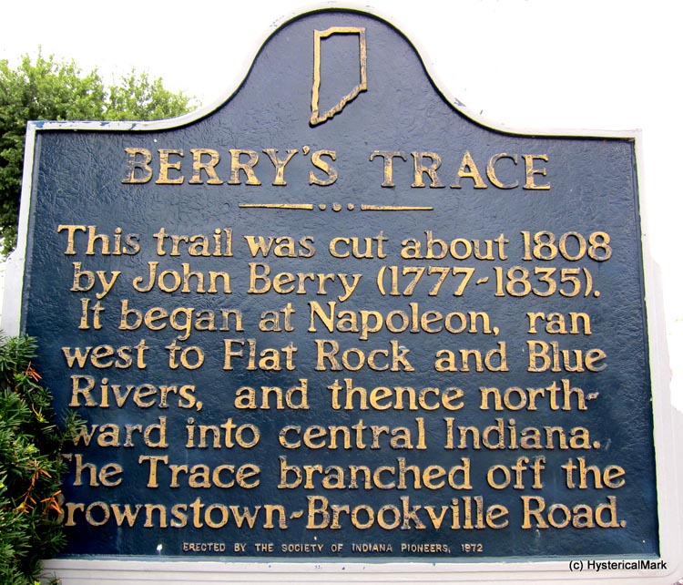 Before coming to central Indiana, John Berry and his family lived along the Ohio River, and by 1808 they were living in Ripley County in the southeast section of the state. From there--as the Indiana Historical Bureau's marker at left explains--Anderson's founder cut a trail into Indiana's central section. This trace was the first marked path or road for families wanting to settle in what would become the region of Indianapolis. |