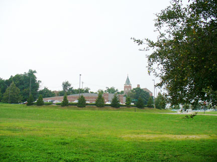 The first cemetery, pictured left, for Anderson's local residents was an area donated by founder Captain John Berry. Before that, though, the land was part of Chief Anderson's village. This location was repurposed in mid 19th century when the Pan Handle Railroad Company needed gravel for construction and so excavated the site. Some of the remains of early settlers were essentially used for fill dirt. The location of the first city cemetery is shown in the map towards the top of the page. The ground now is used as a parking lot for nearby offices. The Eisenhower Bridge is in the background. ("They've paved paradise and put up a parking lot," as the classic rock song says.)