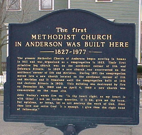 Andersontown pioneers were not without their churches. In 1827, the first Methodist Episcopal Church was organized. Until that year, members had been meeting in each others' homes. Collins Tharp/Thorpe and wife Esther donated land for the church and the congregation's cemetery. The primitive log church was located on the southwest corner of 11th and what is now Brown-Delaware as the Indiana Historic Marker pictured here indicates. The Tharp Cemetery was next to the church and is shown on the map above. Anderson's Methodist Church is now located at the intersection of 12th and Jackson. (For more on the Tharp Cemetery and Collins Tharp, go to the West Maplewood page.) |