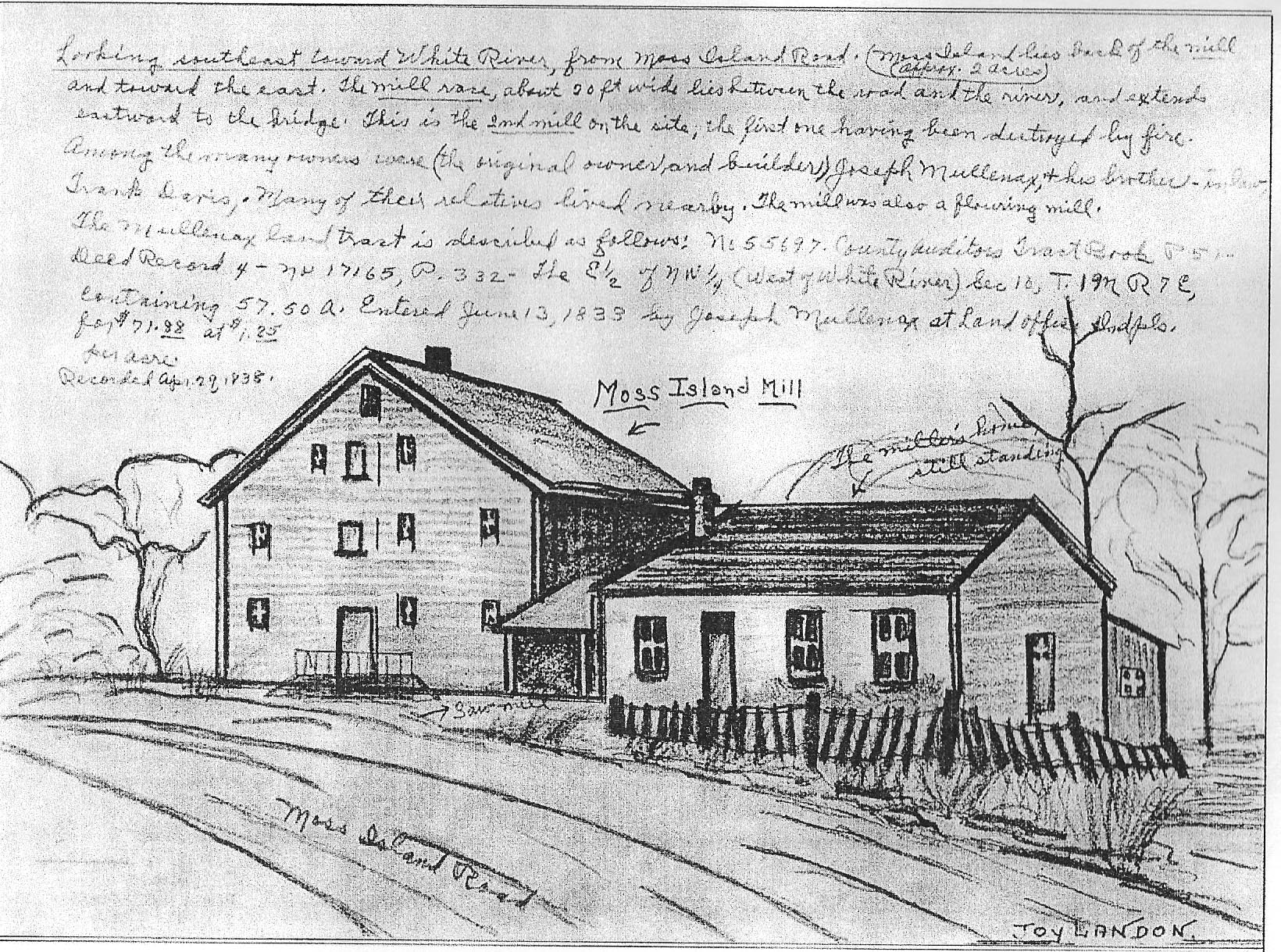 Mills were one of the most important additions to pioneer life. A mill transferred the power of a river's current to grinding stones or cutting blades through the use of a large wooden, paddled wheel situated in the river. The grinding stones converted hard grains into usable flours ,and the blades turned timber into lumber. Thus, pioneers and early settlers had the two most important necessities for survival--food and shelter. According to local county history books, the Moss Island Mills were built in 1836 by Joseph Mullenax. Before that year, the closest mills were in Perkinsville down river and Pendleton overland fourteen miles away. The Moss Island Mills were on the White River and only three miles from Andersontown. They were the hub of industry and farming and benefited everyone in the surrounding townships. This drawing was done in the early 20th century by Andersonian Joy Landon. The explanation at the top reads: Looking southeast toward White River, from Moss Island Road. Moss Island, approximately two acres, lies back of the mill and toward the east. The mill race, about 20 ft. wide lies between the island and the river and extends eastward to the bridge. This is the 2nd mill on the site, the first one having been destroyed by fire. Among the many owners were (the original owner and builder) Joseph Mullenax and his brother-in-;aw Frank Davis. Many of their relatives lived nearby. The mill was also a flour mill. [The artist has the structure labeled as a "saw mill" at the large entry at center.] The Mullenax land tract is described as... Entered June 13, 1838...at land office Indpls. (Indianapolis). |