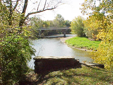The Old and the New in Autumn As the map above shows, across Grand Avenue from West Maplewood Cemetery was one of the old fords by which early residents crossed White River. This picture shows that general area of the river. The foundation stones in the foreground are from a later bridge now improved upon by the Eisenhower Bridge in the background. The historic sections of river bank, which once held the Delaware village and later settlement of Andersontown, are now overseen by the parks department and include walking paths. |