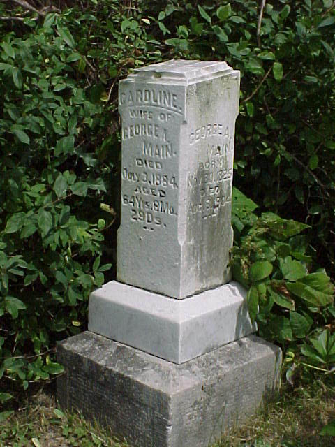 George A. Main, 1825-1904, and wife Caroline Biser, 1818-1884, whose gravestone is pictured right, were some of those mid 19th century settlers from Frederick County, Maryland. George and his brother William Henry Main, 1838-1915, and wife Margaret Martin, 1842-1880, moved to Green Township near the Beech Grove Church site. They and their families can be found on the 1860 census. The Main family descends from the German immigrant Johann George Mehn who settled in Frederick County, Maryland, in 1722. |