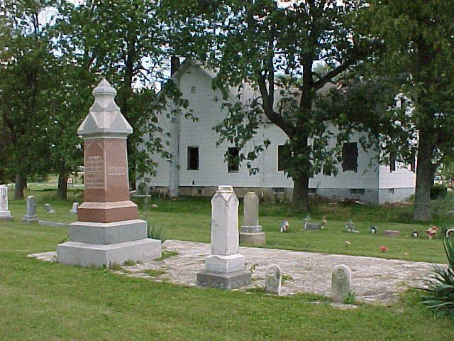 Just off the interstate, the Beech Grove Church of the Brethren's old frame house of worship, in the background, is to be torn down to make room for a gas-convenience station. The congregation will receive a new, larger building located elsewhere. The congregation's cemetery will remain and doubtless will still be used by church members and descendents of the Hoosier settlers buried here. |