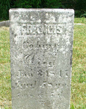 Of special note is the stone above for Francis Coburn. Omitted by some oversight from the list below, Francis died "Jan. 3, 1847 aged 58ys. 5ms. & 5d." This would make his birth year around 1789. The Coburn family illustrates 19th century America's concept of "Manifest Destiny," the migration to and settlement of all land from "sea to shining sea." The Coburn family has origins in the 18th century American colonies of the eastern seaboard. After the Revolution, Francis's ancestors settled in the Ohio section of the Northwest Territory. Francis, himself, traveled with family members from Warren County, Ohio, to Madison County, Indiana, in the mid 1830s. Various relatives can be found on land records for Richland and Lafayette townships. In mid 1800s, Francis's descendants left Indiana seeking land west of the Mississippi. Their travels can be traced in the records of Missouri, Iowa, Oregon, Washington, and finally California on the west coast.
