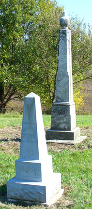 The Victorian style etching at left records members of the Murphy family, Nancy J., who died June 4, 1879, and husband James. Other Murphys are listed below. The Treadway family are represented by the stones at right: Moses, c. 1809-1873, and Sarah, 1807-1889. Relative John was one of the first school teachers across the pike in Lafayette Township. |