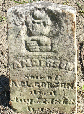 The three stones above are interesting for their uniqueness. The one on the right is for Vina Gorden, who died at fifty-five years in 1877. While this stone has the typical arches and curving lines of Victorian architectural style, it also has atop the data plate the upper torso of a female angel with wings, the only one of this design in the county.
