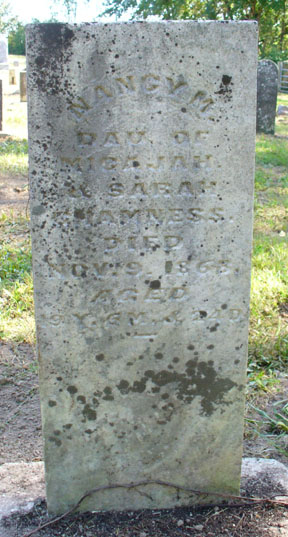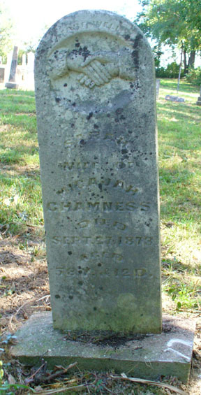 The Chamness family is represented in these four pictures. Above is family elder and pioneer settler Micajah, 1779-1840. His is the oldest legible stone still existing in the Carver. Below left is his wife Sara who died in 1873 at fifty-eight years. The clasped hands represent a married couple's partnership in life. Middle is their daughter Nancy, and at right is their son Isaiah.