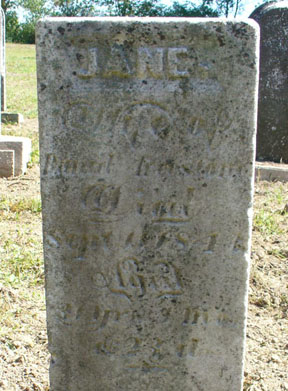 Among the pioneer land owners to Boone Township was the Freestone family. The tablet at right is for "Jane wife of Daniel Freestone died Sept. 11, 1843 aged 31ys 1m 23ds." At left, is the rounded marker for Sarah, mentioned above, who died in 1845 at "61y 25d." |