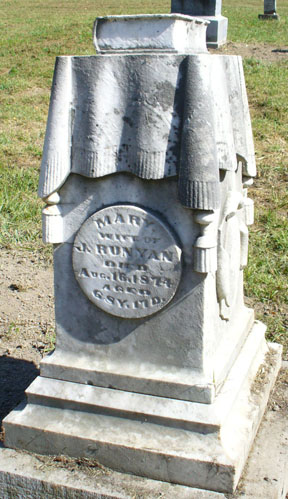 The Runyans, early settlers to Boone Township, have a popular and more elaborate style marker which sits between their graves. It is a pedestal or podium covered in a mourning drape with fringe and tassels and topped by a Bible. Ovals front and back contain the couple's data and the medallion on the side proclaims "Mother and Father." The pictures, left and right, also illustrate the before and after of the Carver's refurbishment since Mary's information could not be seen until the heavy vegetation was eradicated. |