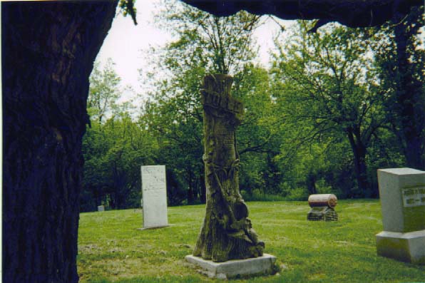A gravestone filled with symbolic meaning from the late 19th century--"a tree cut off" as it was called--is framed by a gnarled living representative (2004). |