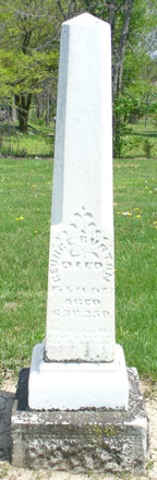 While the earliest burial on the list below is that for Nancy Carroll who died, according to transcribers, in 1847, the earliest Donahoo burial is that for Mary Ellen who "died Nov. 18, 1849 Aged 9 ms. & 20 ds." (Mary Ellen's death date was misread by transcribers.) There are a number of unmarked graves in this family burial ground as evidenced by the sunken rectangular patches in the earth. Any of these might be the reason why the Donahoos began the cemetery. As was customary, once a family began a burial ground, other settlers in the farming neighborhood utilized its services.