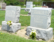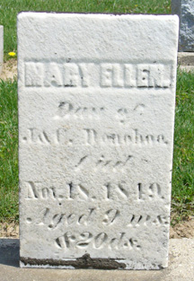 There are ten stones here marking the graves of Donahoo family members, and a modern genealogist always has the graves of some of the more recent ancestors decorated. An early stone for daughter Mary Ellen is pictured left, and the decorated stones for late 19th century ancestors are pictured right. |
