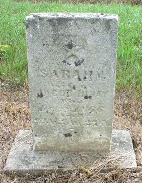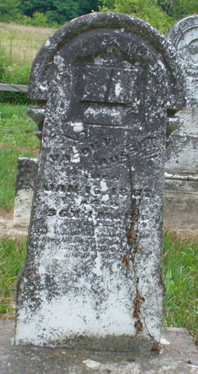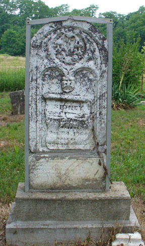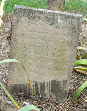 Below are the simpler stones for other early settlers along Lick Creek in Green Township. Top left, is that for Joshua, son of Joseph Chitwood, who died in 1843. His brown granite stone is quite legible when chalked. Top right is for a child of the Wallace family who died in 1851. Below are two stones for the wives of Jacob Hiday: left, Sarah who died in 1866 and right, Margaret who died in 1849. While the latter is not listed on the burial record by some oversight, the Hidays were some of the very first settlers in all of Madison County. (For more, go to the Hiday Cemetery page.)