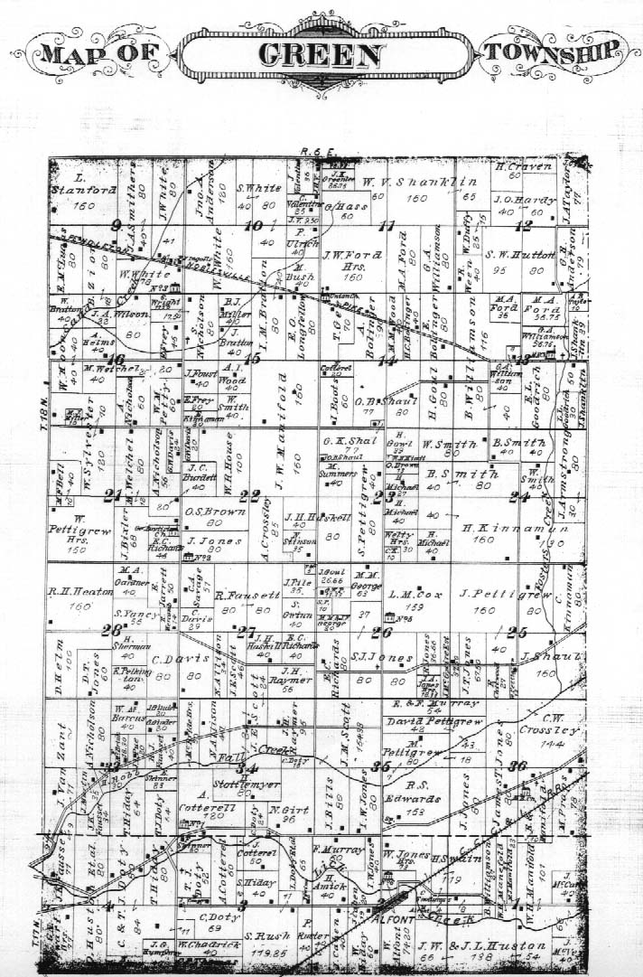Twelve pioneer cemeteries are listed in this township: Anderson, Beech Grove, Cottrell, Doty/Emment, Fausset, Hiday, Jones, Kinnaman (destroyed), Mt. Carmel, Nicholson, Pleasant Valley/Pleasant View/Valentine, and Smithers. Many of these family burial grounds are located along the old Indiana Highway, now named Reformatory Road. This was one of the first state roads cut into the wilderness. Back in pioneer days, a road was any trail or path or route "traced" by hash marks cut into the trees of the surrounding dense forest. For that reason, these routes were also called "traces." For many years, the Indiana Highway was the only trail between Pendleton and Indianapolis and as such acquired a large number of early settlers and therefore many pioneer cemeteries. Below, the 1876 plat map for Green Township clearly shows the Indiana Highway running between Fall Creek and Lick Creek. Along the north bank of Fall Creek can be seen another old pioneer trace. Second and third generation Hidays, Dotys, and Hustons still own the land, and farther north the Nicholson, Williamson, Wilson, and Kinnaman families are still represented.