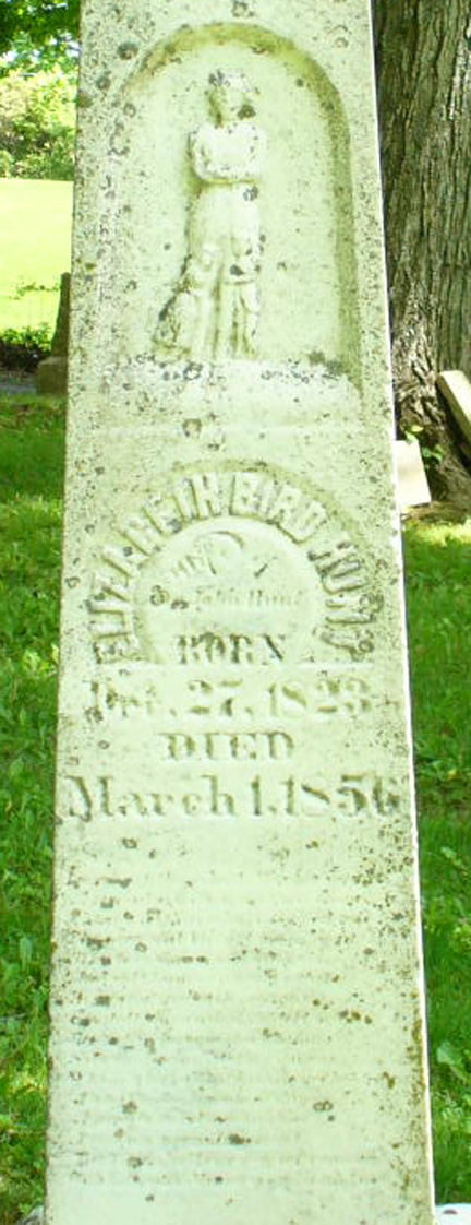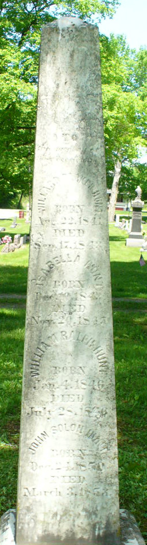 Elizabeth Bird Hunt, left, has a stone unique in Madison County. On the west face of her stele at the top is a relief of her and two of her young children clinging to her legs. Elizabeth was born December 27, 1823, and was wife to Dr. John Hunt, son of early settlers William and Eliza Hunt. On the south face of the same stone, right, is a list of her children who died at a young age and who are buried in the same plot of graves: Isabella died at almost two years of age November 20, 1845; William Ralph was only six months with he died July 28, 1846; Willard Parker Hunt when eight years old died in 1849; and James Solon died at just over two years March 3, 1853. Elizabeth died three years later--March 1, 1856. |