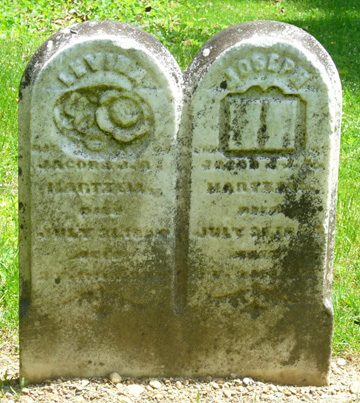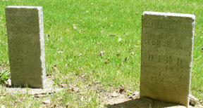 Not uncommon for the period is the double headstone, left, for two year old Levina Hartzell, who died July 21, 1854, and three year old Joseph Hartzell, who died four days later. Two bodies in one grave is also not uncommon. This was occasionally done for small children who died soon after one another, as in this situation, or in the case of a mother and her child who both died during the birthing process. Leonard, right, who died when four years old in 1842, is the only Foster on the burial list from the first half of the 19th century. Either his parents moved away after his death or are themselves buried here in unmarked graves. |