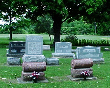 In the foreground, the stone cylinders or "pillows" popular in the early 20th century are for John and Sarah Hull. Both John and Sarah were first generation Madison County residents. Their family, log home, and farm are pictured on the Madison County history page. (For more on 19th century memorial styles, go to West Maplewood Cemetery.) |