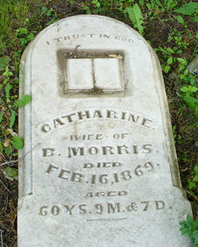 Folks who lived in the Victorian era-- i.e. most of the 19th century and the first few years of the 20th-- loved memorial symbols. Catherine's bible at the top of her stone, left, represented her Christian faith. The drapes on the two late century pillars, middle, symbolized mourning for the departed as does Silas Trayer's weeping willow, right.