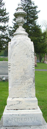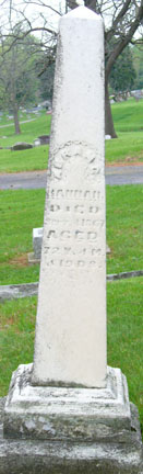 The Carvers were from a large family who pioneered the northern sections of Madison County in the first third of the 19th century. Another branch of the family actually began the large Carver Cemetery in Boone Township. Here in Monroe Township's IOOF Cemetery, Eleazer and Elizabeth Carver's pillar is pictured left while the close-up of Elizabeth's data on the south face is at right. The stark white color and crispness of the stone's re-incised lettering are the result of the trustee's 1990 refurbishment of the earliest grave markers. |