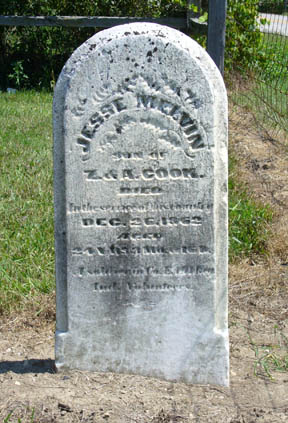 Marking the end of the period of early settlement for Richland Township and all of Madison County was the Civil War. At right, the stone for Jesse Melvin Cook, "son of Z. & A. Cook, died 'In the service of his county,' Dec. 26, 1862, aged 24 years..." The incising is still remarkably legible. |
