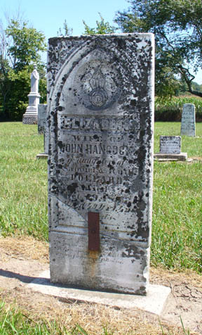 The Jones-Heagy Cemetery's Hancock family were among the early settlers to the county's east-central Richland Township. John, son of Joseph discussed above, was born in Ohio March 8, 1804. His wife Elizabeth Pollard was born in Kentucky in 1807. They were married in 1826 in Wayne County, Indiana, and their son Joseph was born there January 5, 1831. Other children of the John Hancock family were Nancy, Ruth, Pollard, George, Fanny, and Rebecca. The Hancocks migrated later in the 1830s and were among those farmers taking advantage of the township's "rich land." Son Joseph eventually married Esther Fountain whose people had moved to the county from Maryland also in the 1830s. Joseph and Esther's children were Sarah, John, Mary, William, Joseph, James, and Martha. There are eleven of the Hancock name buried at the Jones Cemetery as well as collateral branches of the family.