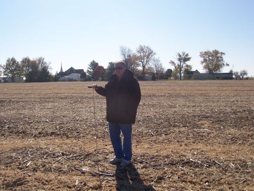 In the picture below (c. 2007), MCCC member Devon Dow is standing at the approximate location for the Leisure Cemetery. The hamlet of Leisure is in the background. Eye witnesses explained that the now destroy cemetery use to be about a quarter mile north of the large tree on the extreme right. This tree sits along CR 1800N, and Devon is standing directly west of the tree in the picture above. (GPS coordinates can be found for the Leisure Cemetery on this web site's Cemetery List.)