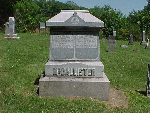 The McAllisters/McCallisters family, who gave their name to this cemetery, came from Virginia and initially settled on the south bank of Lick Creek in the spring of 1829. They were some of the first pioneers to homestead the untouched timber of Adams Township. Other family members followed, and together they helped civilize the broader community of Madison County. Foremost among the clan was Thomas McCallister, 1794-1852. He was elected in 1842 as a representative to the Indiana State Legislature; he served for eleven years. He was then voted to the state senate but died before he could take office. Others of the family held positions as sheriff, judge, justice of the peace, and county commissioner. It is also noteworthy that the McAllisters were numerous and included many single females who arrived in this area, married, established homes, and nurtured generations of descendants. (As an example, see Susan McAllister Brown, on the Hardy-Culp page.)