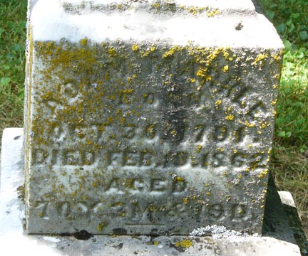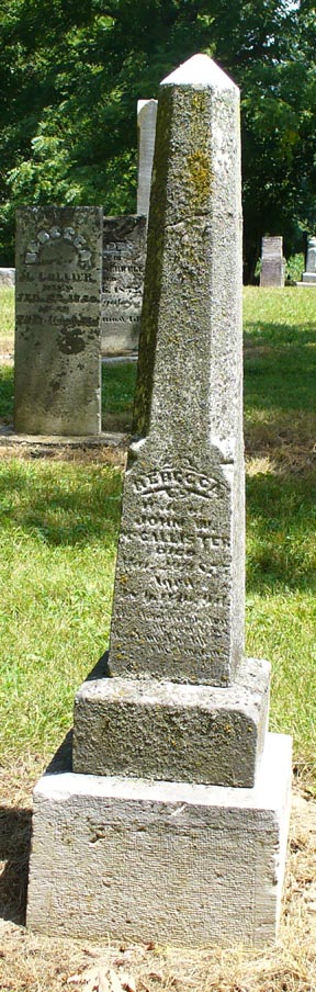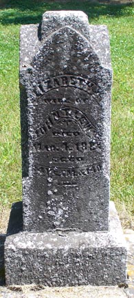 The McAllister Cemetery holds several other pioneer families important to the development of southern Madison County. The Markle family section is on the east side in the cemetery and just north of the gate as one enters. John Markle, right, who was born in 1793 in New York, came to the area in 1823 and laid out the village of Markleville in 1854. According to county historian Samuel Harden who knew him personally, John was "strictly honest; his word was as good as his note; ... a man of strong mind and will, though he had little education. He was a great reader, and had the Constitution of the United States by heart [!!]." John Markle died in 1865. (For more on Markle and Markleville, go to Adams Township page.) John's wife Sarah/Sallie Allen was born in North Carolina in 1797. She died in 1862 in Markleville and is also buried at this location.
