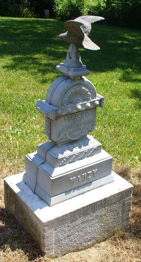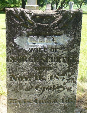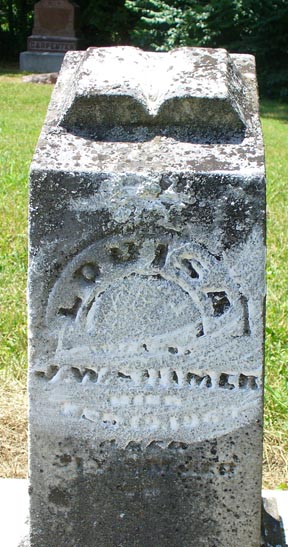 Female settlers had difficult, dangerous lives. Hard work, diseases, and childbirth, especially, took their toll. Esther Cook, left, wife of Daniel died in 1849. She has one of the few tablet-type granite stones at this cemetery. At right, Maggie, wife of W. H. Hardy, died in 1886 when only twenty-two years old. Her pretty Victorian marker is in the form of a tree with lilies and ferns growing around the trunk. On top is depicted a basket of flowers. |
