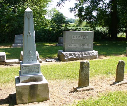 At left, the metal grave marker, is for Samuel Markle who died in 1880; the smaller stones extending to the right in the picture are for his children who died when young. Markles from mid 20th century are seen in the background of this view of the Markle section.