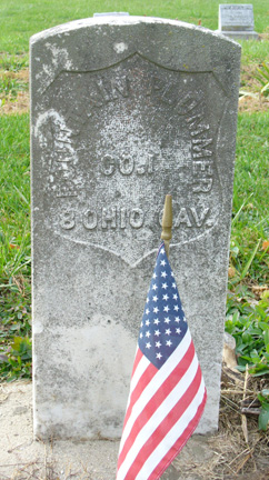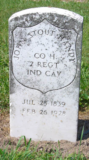 The Moonsville Cemetery safeguards its share of veterans. The shield on the stones, left and right, denotes a Civil War veteran. John Stout Handy, right, is listed in the Cemetery Record of Deceased Veterans. As his stone testifies, John served during the Civil War in Indiana's Cavalry, 2nd Regiment, Company H, and lived to be almost eighty-nine years old. At left, serving in Co. 1 8th Ohio Cavalry, Fountain Plummer's name was obviously derived from the marital union between two members of the Fountain and the Plummer families.