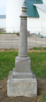 At left, Richland Township early settler George Fountain, died November 8, 1854, at "48y 9m 18d." His wife Mary's pillar is center; she died March 29, 1875/6, at sixty-four years of age. At right, an unnamed Fountain family daughter lived only five days in 1865.