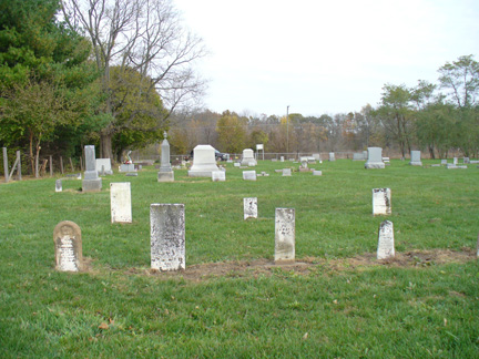 Looking east from the back of the Moonsville Cemetery, this view shows the earliest stones, now reset (2007), with the newer stones closer to the gate, sign, and road. While the cemetery was begun in the 1840s, the majority of recorded burials at the Moonsville Cemetery are from the 20th century. Additionally, this settlers' graveyard is still being used in the 21st century by family members and area residents. The cemetery is located on what used to be called the Moonsville Pike (CR 350E), a short distance south of its namesake.