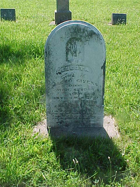 A beautifully preserved stone from mid 19th century is Electa Givens'. She was the wife of Jacob and died March 6, 1864, at "44Y 4M 27D." Electa has the distinction of being the first white child born in Green Township--November 1820. She was a Shaul. |